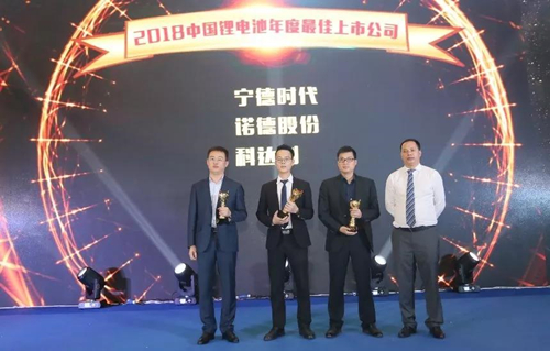 The picture shows that Nord shares, Ningde Times and Kodali have jointly won the “Best Listed Company of China Lithium Battery in the Year 2018”.