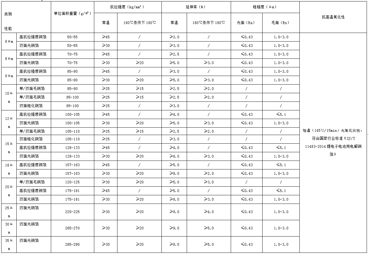 注:1. 針對(duì)客戶(hù)特定需求,銅箔抗氧化性能、面密度指標(biāo)還可作協(xié)商調(diào)整。